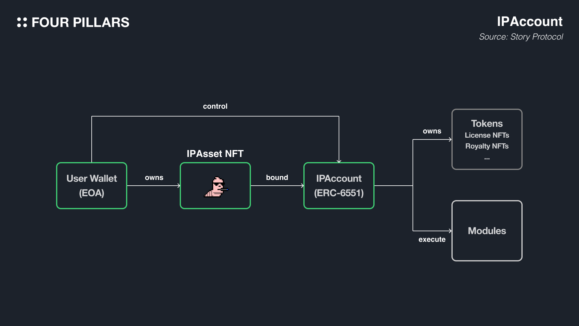 IPAccount는 ERC-6551의 수정버전에 기반하는 계정으로, 각 IPAsset에 하나씩 페어링되어 있으며, IPAsset의 소유권이 이전되면 IPAccount 역시 함께 이동한다. ERC-6551이기 때문에 License NFT, Royalty NFT와 같은 토큰들을 소유할 수 있고, 다양한 Modules를 실행할 수 있다. Story Protocol과 모든 상호작용은 IPAccount를 중심으로하며, 라이센싱, 로열티 쉐어링, 리믹싱 등 핵심 기능들이 IPAccount 덕분에 가능해진다. IPAccount의 핵심 기능은 execute() 함수를 통해 임의의 Verb (Module)를 호출(call)하는 것이다.