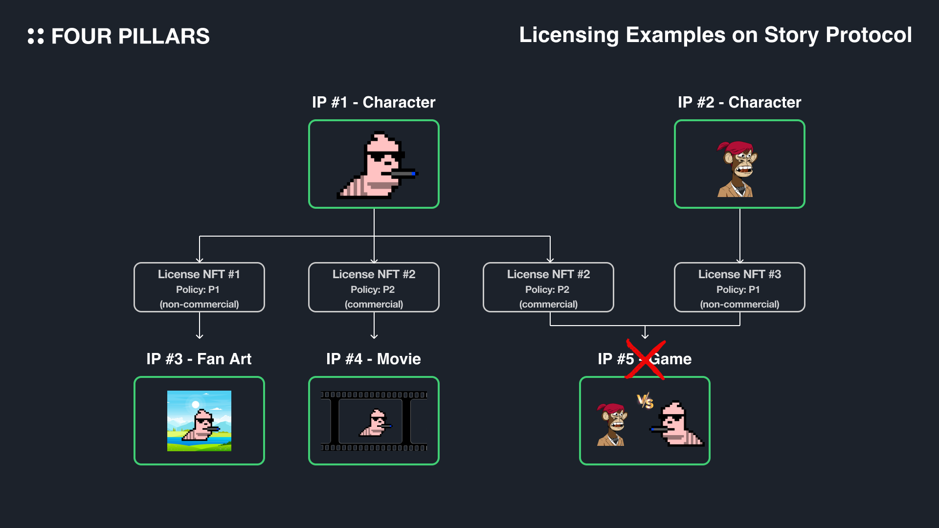 특정 IP의 License NFT 보유자만이 그 IP(Parent IP)의 파생 IP(Derivative IP)를 생성할 수 있으며, Derivate IP가 Parent IP 아래로 등록됨에 따라 License NFT는 소각된다. 예를 들어 Larva Lads의 소유자는 IP #1을 등록을 했고, 상업적 이용이 불가능한 Policy인 P1이 명시되어있는 License NFT #1을 1개, 상업적 이용이 가능한 P2가 명시된 License NFT #2를 2개 민팅했다고 하자. License NFT #1의 소유자는 이를 소각하여 비상업적 목적으로 팬아트와 같은 IP #3을 등록할 수 있다. 마찬가지로 License NFT #2 소유자는 상업적 목적으로 영화와 같은 IP #4를 등록할 수 있다.